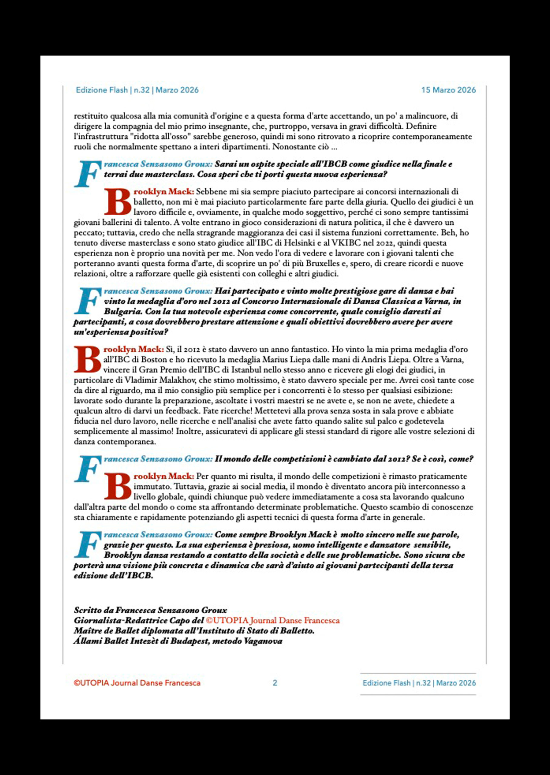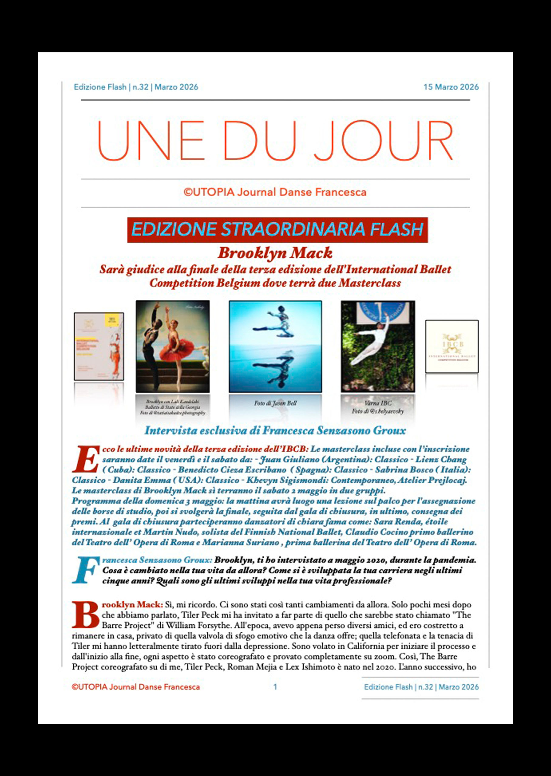 ©UTOPIA Journal Danse Francesca Edizione Flash n.32 15 Marzo 2026 « Brooklyn Mac sarà giudice alla finale della terza edizione dell’International Ballet Competition Belgium dove terrà due Masterclass. Intervista esclusiva« #©utopiajournaldansefrancesca