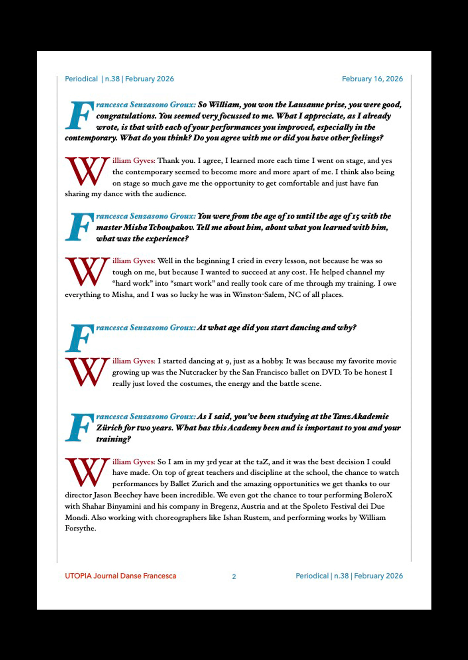 ©Utopia Journal Danse Francesca Periodical n.38 February 16, 2026 « I introduce you William Gyves winner of the Lausanne Award 2026 ».Exclusive interview. #utopiajournaldansefrancesca